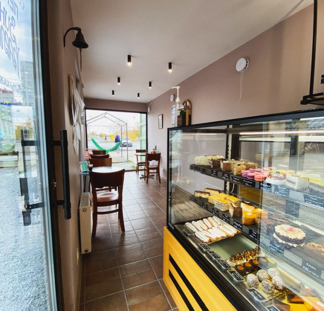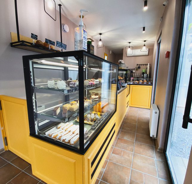Требовалось решение под кондитерскую, с витринами и зоной посадки для гостей.