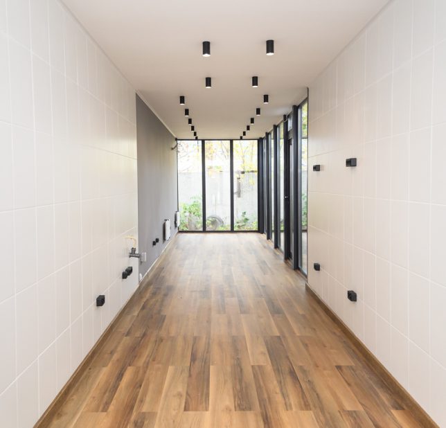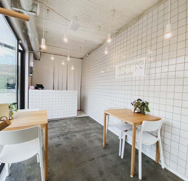 Изготовлен 1-модульный контейнер разделенный на 2 зоны. Зона готовки и выкладки продукции полностью отделана плиткой, а зона для гостей преимущественно состоит из витражей, остальные стены покрашены. Подготовлены закладные под оборудование.