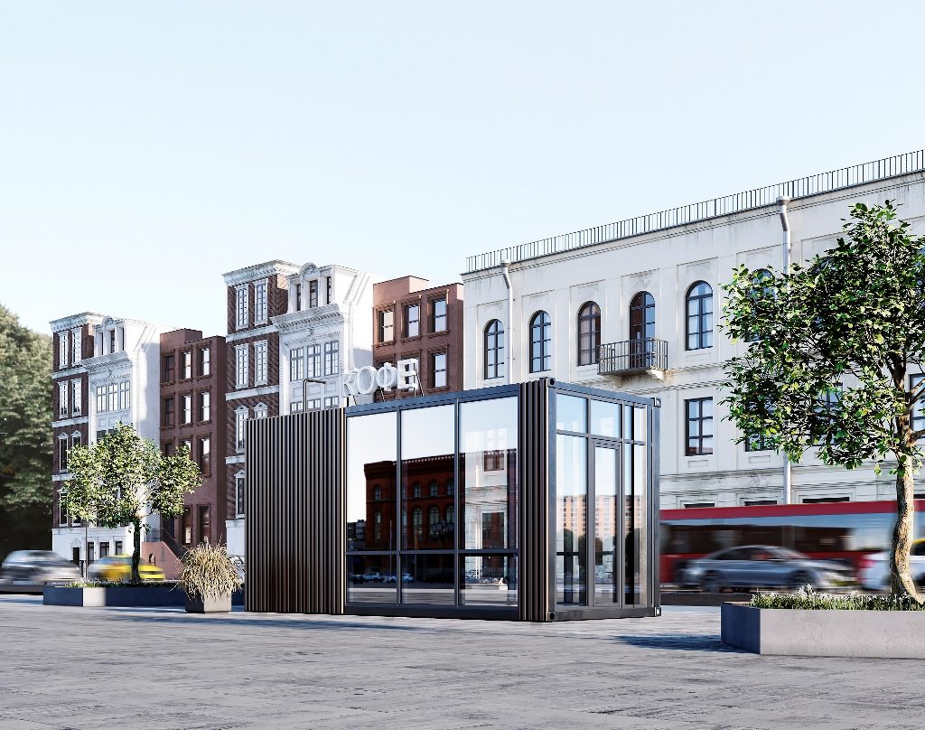 Изготовлен 1-модульный контейнер, где одновременно комфортно могут разместиться до 10 посетителей. Место работы бариста имеет несколько рабочих зон. Остекление выполнено с учетом видовых характеристик локации и трафика.
