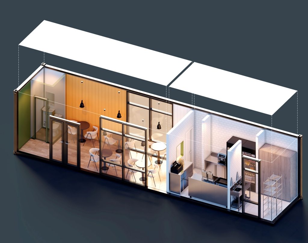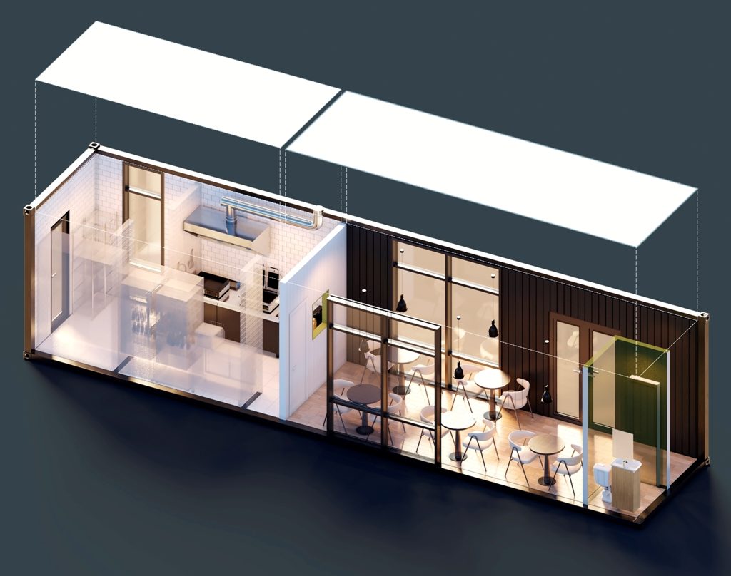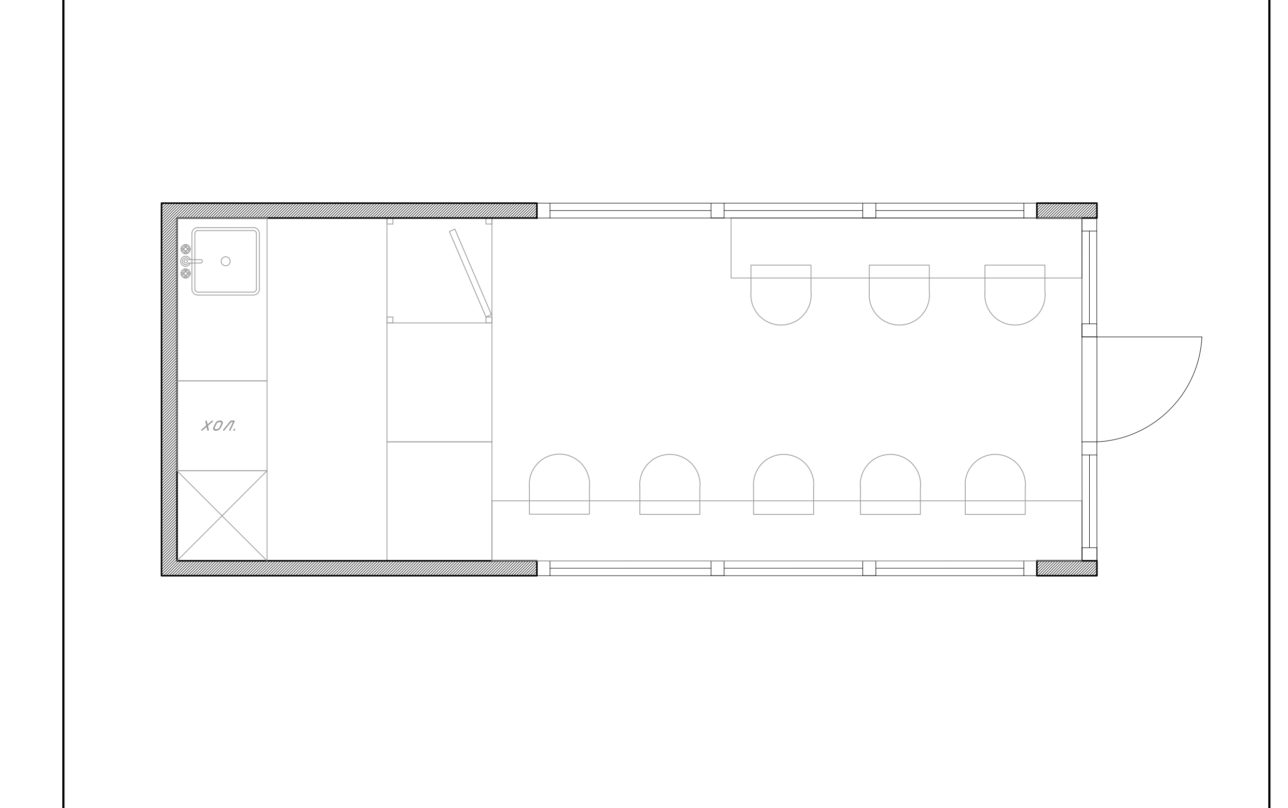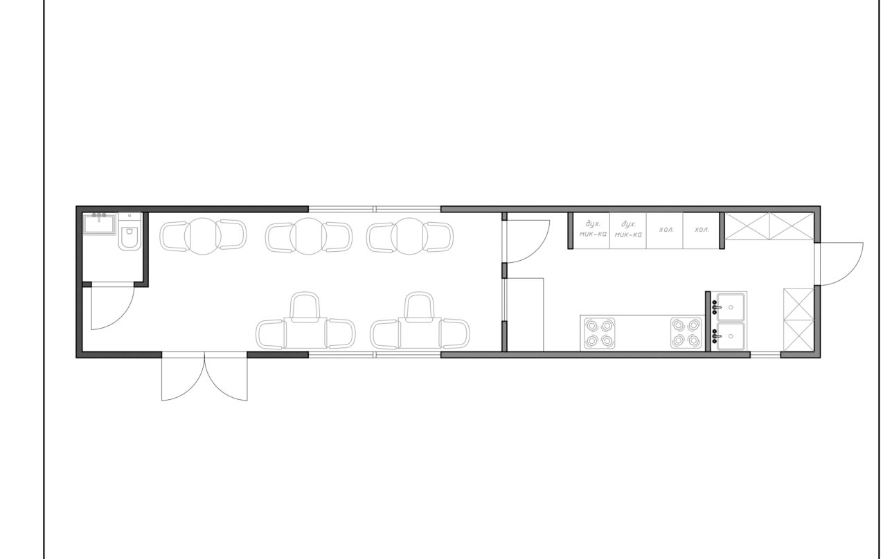 Изготовленный модуль разделен на 2 части, в первой расположены зоны приготовления, хранения блюд и продуктов, сбора заказа и оплаты. Планировка позволяет комфортно находиться на кухне 3 поварам и кассиру. Вторая половина контейнера обеспечивает посадку до 10 человек.